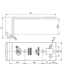 Grenouillère : dim. entraxe 4 trous oblong 7 x 5 mm. L 32 mm x H 25 mm.